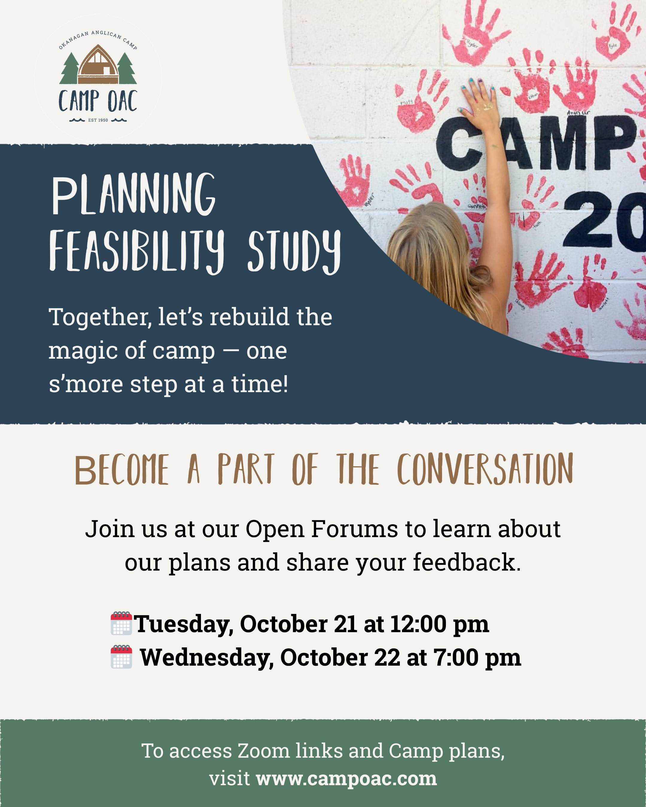 We want to hear from you! Share your insights, ask your questions, and help shape the vision for Camp OAC’s future at one of our upcoming Open Forums: